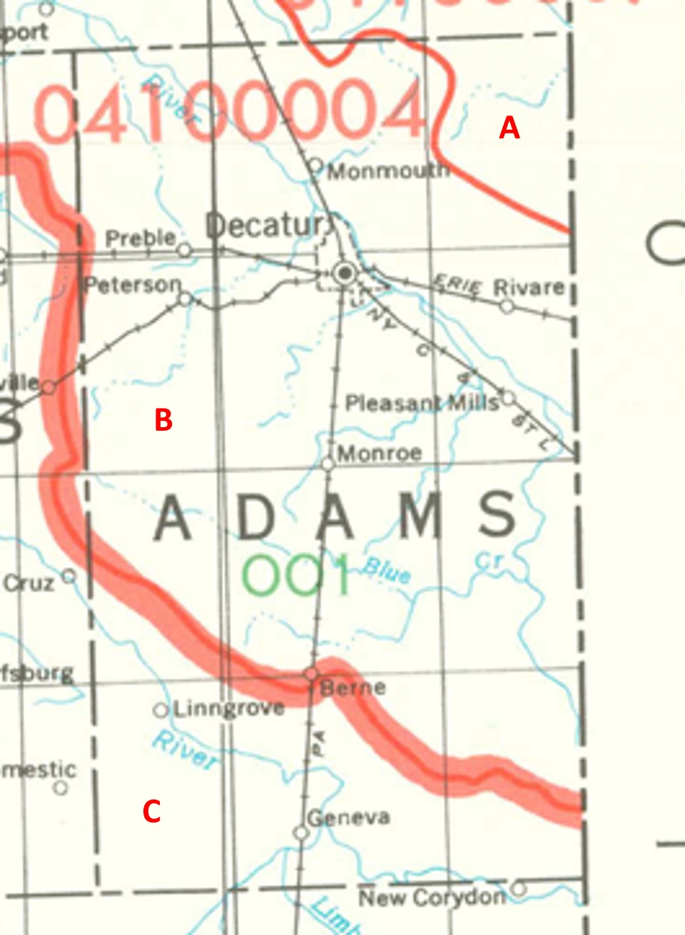 Adams County drains into three different 8-digit hydrologic units, each represented on the image above by an area between red lines and within the county boundary, designated by a letter. Clicking on a watershed name below will take you to separate page with more information on that watershed.