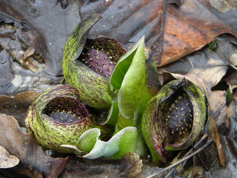If Skunk Cabbage isn't our earliest-blooming native spring wildflower, it is certainly one of the first to show up. These plants favor wet areas, often in large colonies. After flowering they grow to considerable size, maybe two or three feet across, perhaps looking a bit like cabbages of a sort. (see below)
