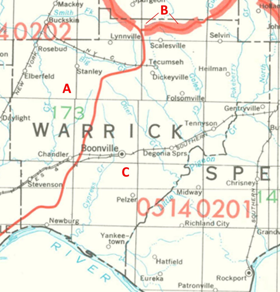 Warrick County drains into three different 8-digit hydrologic units, each represented on the image above by an area between red lines and within the county boundary, designated by a letter. Clicking on a watershed name below will take you to separate page with more information on that watershed.